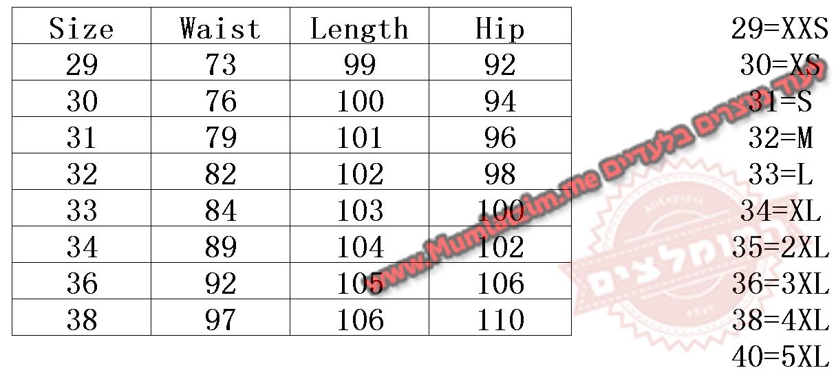 בחירת מידה לפי הטבלה – זהה למידת ג'ינס ישראלי, לוודא בטבלה גם לפי WAIST היקף מותניים