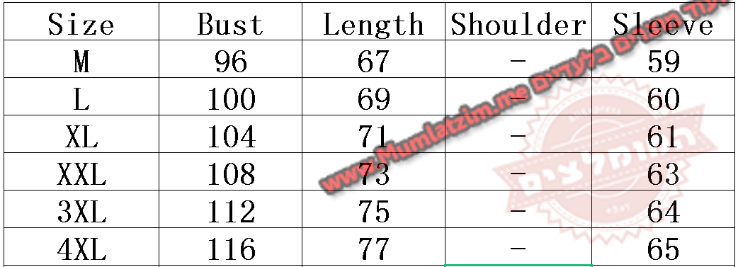 בחירת מידה לפי הטבלה – לקחת 2-3 מידות מעל ישראל, לוודא