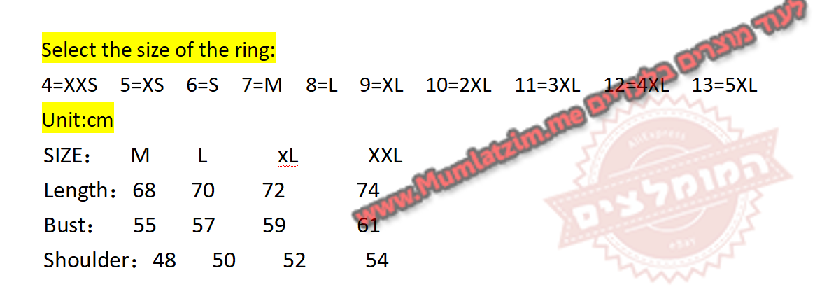 | לקרוא לפני ההזמנה! לא לשלוח למוכר הודעות המכילות תמונות או שמות של מותגים בעלי אקספרס! שליחת הודעות אלה מסכנות את המוכר ועלולות לגרום לסגירת החנות שלו. במידה ויש בעיה – לא לפתוח מחלוקות, לשלוח הודעה בעלי אקספרס למוכר שיש בעיה ואת מספר הווטסאפ שלכם והוא יפנה אליכם ויעזור! בנוסף – ניתן לפתוח קריאת שירות אצלנו ונענה בהקדם – פתיחת קריאה מפה קיבלתם את המוצר? מעולה! בבקשה לא להשאיר פידבק בחנות עם תמונה של המוצר! לוודא מחיר וקוד מוצר לפני רכישה! – המחיר לא מתאים / קוד לא מתאים / אין קוד – לא לקנות! יש לדווח לנו על לינק לא פעיל! שימו לב – לפני לחיצה על תשלום יש לוודא כי המידה שבחרתם היא מה שמופיעה • המוכר מסתיר את המוצר, בעלי אקספרס כנראה יופיע מוצר אחר, בפועל המוכר יודע לשלוח את המוצר בדיוק כמו בתמונות פה למטה! לא לשלוח שום הודעה אחרת שלא קשורה למידה/החלפת צבע/משלוח – לא לבקש גלרייה/לא לבקש ווטסאפ/לא לרשום דברים שקשורים למותגים – כל מי שיעשה זאת ייחסם על ידי המוכר במידית