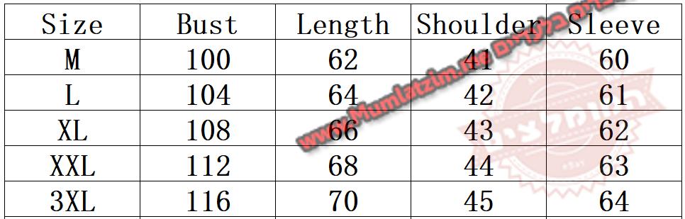 בחירת מידה לפי הטבלה – לקחת 2 מידות מעל ישראל, לוודא