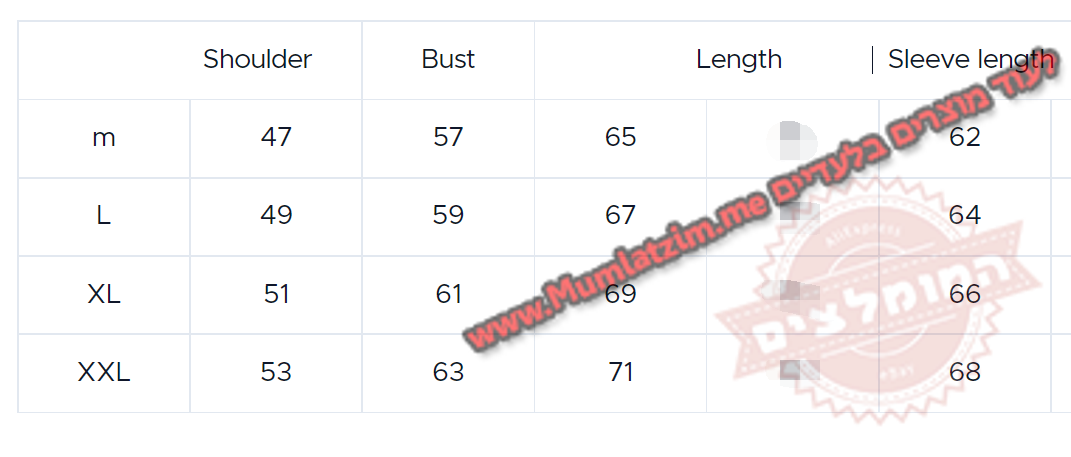 בחירת מידה לפי הטבלה – לקחת 2 מידות מעל ישראל, לוודא