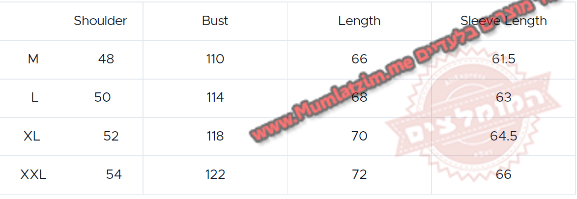 בחירת מידה לפי הטבלה – לקחת 1-2 מידות מעל ישראל, לוודא