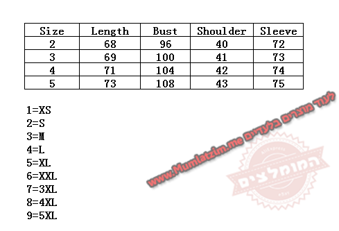 • בחירת מידה לפי הטבלה ~ המלצה לקחת מידה מעל ישראל, לוודא בטבלה!