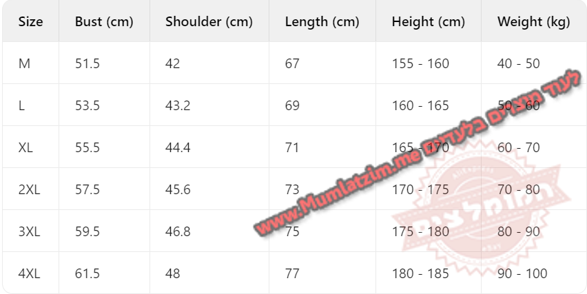 בחירת מידה לפי הטבלה –