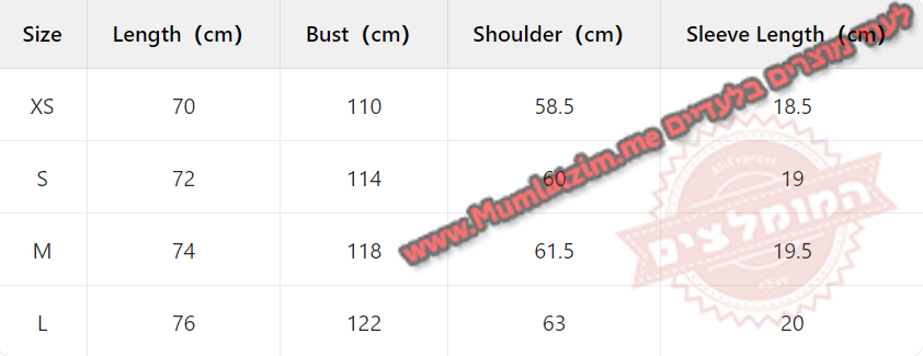 בחירת מידה לפי הטבלה – מידות OVERSIZE שימו לב!