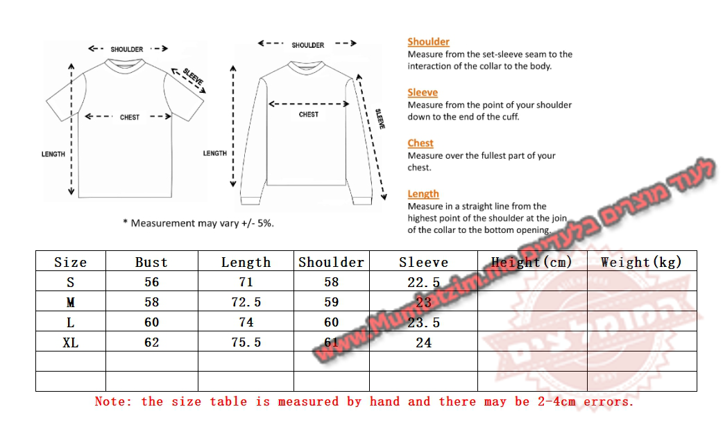 | לקרוא לפני ההזמנה! לא לשלוח למוכר הודעות המכילות תמונות או שמות של מותגים בעלי אקספרס! שליחת הודעות אלה מסכנות את המוכר ועלולות לגרום לסגירת החנות שלו. במידה ויש בעיה – לא לפתוח מחלוקות, לשלוח הודעה בעלי אקספרס למוכר שיש בעיה ואת מספר הווטסאפ שלכם והוא יפנה אליכם ויעזור! בנוסף – ניתן לפתוח קריאת שירות אצלנו ונענה בהקדם – פתיחת קריאה מפה קיבלתם את המוצר? מעולה! בבקשה לא להשאיר פידבק בחנות עם תמונה של המוצר! • המוכר מסתיר את המוצר, בעלי אקספרס כנראה יופיע מוצר אחר, בפועל המוכר יודע לשלוח את המוצר בדיוק כמו בתמונות פה למטה! לא לשלוח שום הודעה אחרת שלא קשורה למידה/החלפת צבע/משלוח – לא לבקש גלרייה/לא לבקש ווטסאפ/לא לרשום דברים שקשורים למותגים – כל מי שיעשה זאת ייחסם על ידי המוכר במידית