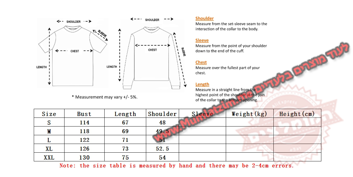 | לקרוא לפני ההזמנה! לא לשלוח למוכר הודעות המכילות תמונות או שמות של מותגים בעלי אקספרס! שליחת הודעות אלה מסכנות את המוכר ועלולות לגרום לסגירת החנות שלו. במידה ויש בעיה – לא לפתוח מחלוקות, לשלוח הודעה בעלי אקספרס למוכר שיש בעיה ואת מספר הווטסאפ שלכם והוא יפנה אליכם ויעזור! בנוסף – ניתן לפתוח קריאת שירות אצלנו ונענה בהקדם – פתיחת קריאה מפה קיבלתם את המוצר? מעולה! בבקשה לא להשאיר פידבק בחנות עם תמונה של המוצר! • המוכר מסתיר את המוצר, בעלי אקספרס כנראה יופיע מוצר אחר, בפועל המוכר יודע לשלוח את המוצר בדיוק כמו בתמונות פה למטה! לא לשלוח שום הודעה אחרת שלא קשורה למידה/החלפת צבע/משלוח – לא לבקש גלרייה/לא לבקש ווטסאפ/לא לרשום דברים שקשורים למותגים – כל מי שיעשה זאת ייחסם על ידי המוכר במידית