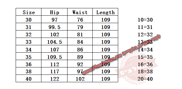 • בחירת מידה לפי הטבלה ~ בערך זהה לארץ, לבחור לפי מידת ג'ינס ישראלי ולוודא WASIT היקף מותניים