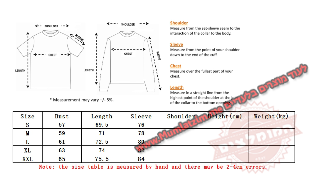 | לקרוא לפני ההזמנה! לא לשלוח למוכר הודעות המכילות תמונות או שמות של מותגים בעלי אקספרס! שליחת הודעות אלה מסכנות את המוכר ועלולות לגרום לסגירת החנות שלו. במידה ויש בעיה – לא לפתוח מחלוקות, לשלוח הודעה בעלי אקספרס למוכר שיש בעיה ואת מספר הווטסאפ שלכם והוא יפנה אליכם ויעזור! בנוסף – ניתן לפתוח קריאת שירות אצלנו ונענה בהקדם – פתיחת קריאה מפה קיבלתם את המוצר? מעולה! בבקשה לא להשאיר פידבק בחנות עם תמונה של המוצר! • המוכר מסתיר את המוצר, בעלי אקספרס כנראה יופיע מוצר אחר, בפועל המוכר יודע לשלוח את המוצר בדיוק כמו בתמונות פה למטה! לא לשלוח שום הודעה אחרת שלא קשורה למידה/החלפת צבע/משלוח – לא לבקש גלרייה/לא לבקש ווטסאפ/לא לרשום דברים שקשורים למותגים – כל מי שיעשה זאת ייחסם על ידי המוכר במידית