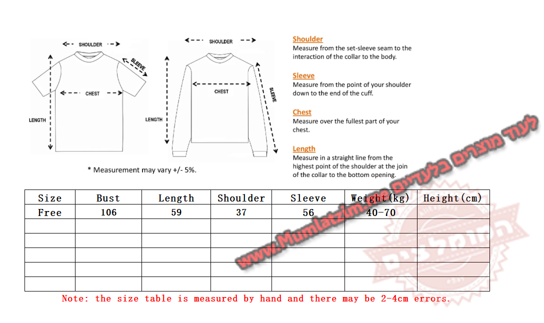 | לקרוא לפני ההזמנה! לא לשלוח למוכר הודעות המכילות תמונות או שמות של מותגים בעלי אקספרס! שליחת הודעות אלה מסכנות את המוכר ועלולות לגרום לסגירת החנות שלו. במידה ויש בעיה – לא לפתוח מחלוקות, לשלוח הודעה בעלי אקספרס למוכר שיש בעיה ואת מספר הווטסאפ שלכם והוא יפנה אליכם ויעזור! בנוסף – ניתן לפתוח קריאת שירות אצלנו ונענה בהקדם – פתיחת קריאה מפה קיבלתם את המוצר? מעולה! בבקשה לא להשאיר פידבק בחנות עם תמונה של המוצר! • המוכר מסתיר את המוצר, בעלי אקספרס כנראה יופיע מוצר אחר, בפועל המוכר יודע לשלוח את המוצר בדיוק כמו בתמונות פה למטה! לא לשלוח שום הודעה אחרת שלא קשורה למידה/החלפת צבע/משלוח – לא לבקש גלרייה/לא לבקש ווטסאפ/לא לרשום דברים שקשורים למותגים – כל מי שיעשה זאת ייחסם על ידי המוכר במידית