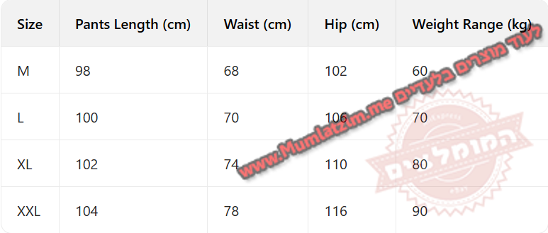 בחירת מידה לפי הטבלה –