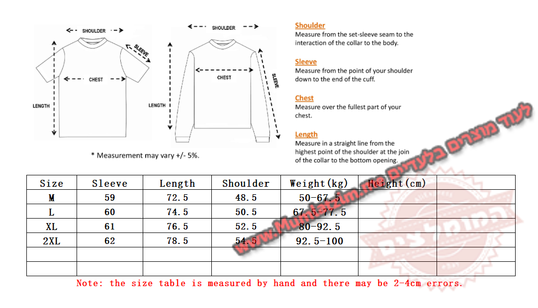 | לקרוא לפני ההזמנה! לא לשלוח למוכר הודעות המכילות תמונות או שמות של מותגים בעלי אקספרס! שליחת הודעות אלה מסכנות את המוכר ועלולות לגרום לסגירת החנות שלו. במידה ויש בעיה – לא לפתוח מחלוקות, לשלוח הודעה בעלי אקספרס למוכר שיש בעיה ואת מספר הווטסאפ שלכם והוא יפנה אליכם ויעזור! בנוסף – ניתן לפתוח קריאת שירות אצלנו ונענה בהקדם – פתיחת קריאה מפה קיבלתם את המוצר? מעולה! בבקשה לא להשאיר פידבק בחנות עם תמונה של המוצר! • המוכר מסתיר את המוצר, בעלי אקספרס כנראה יופיע מוצר אחר, בפועל המוכר יודע לשלוח את המוצר בדיוק כמו בתמונות פה למטה! לא לשלוח שום הודעה אחרת שלא קשורה למידה/החלפת צבע/משלוח – לא לבקש גלרייה/לא לבקש ווטסאפ/לא לרשום דברים שקשורים למותגים – כל מי שיעשה זאת ייחסם על ידי המוכר במידית