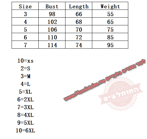 בחירת מידה לפי הטבלה – לקחת 1-2 מידות מעל ישראל, לוודא