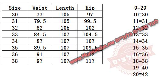בחירת מידה לפי הטבלה – זהה למידת מכנסיים בארץ, לוודא בטבלה גם לפי WAIST היקף מותניים