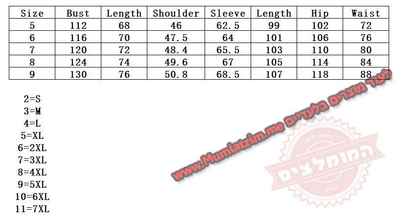 בחירת מידה לפי הטבלה – לקחת 2 מידות מעל ישראל, לוודא