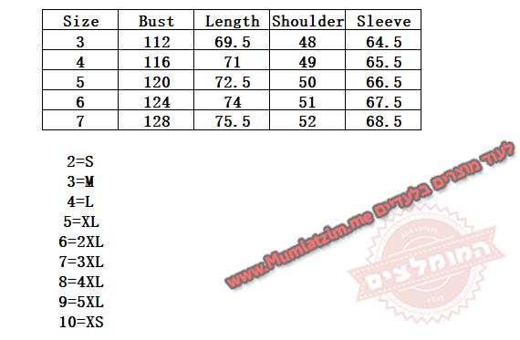 בחירת מידה לפי הטבלה – לקחת 2 מידות מעל ישראל, לוודא