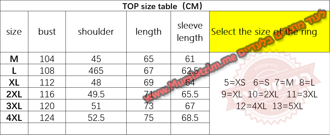 בחירת מידה לפי הטבלה – לקחת 2 מידות מעל ישראל, לוודא