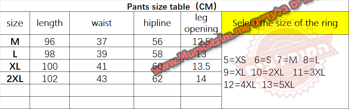 בחירת מידה לפי הטבלה –
