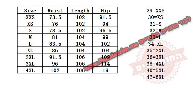 בחירת מידה לפי הטבלה – זהה למידת ג'ינס בארץ, לוודא גם לפי WAIST היקף מותניים!